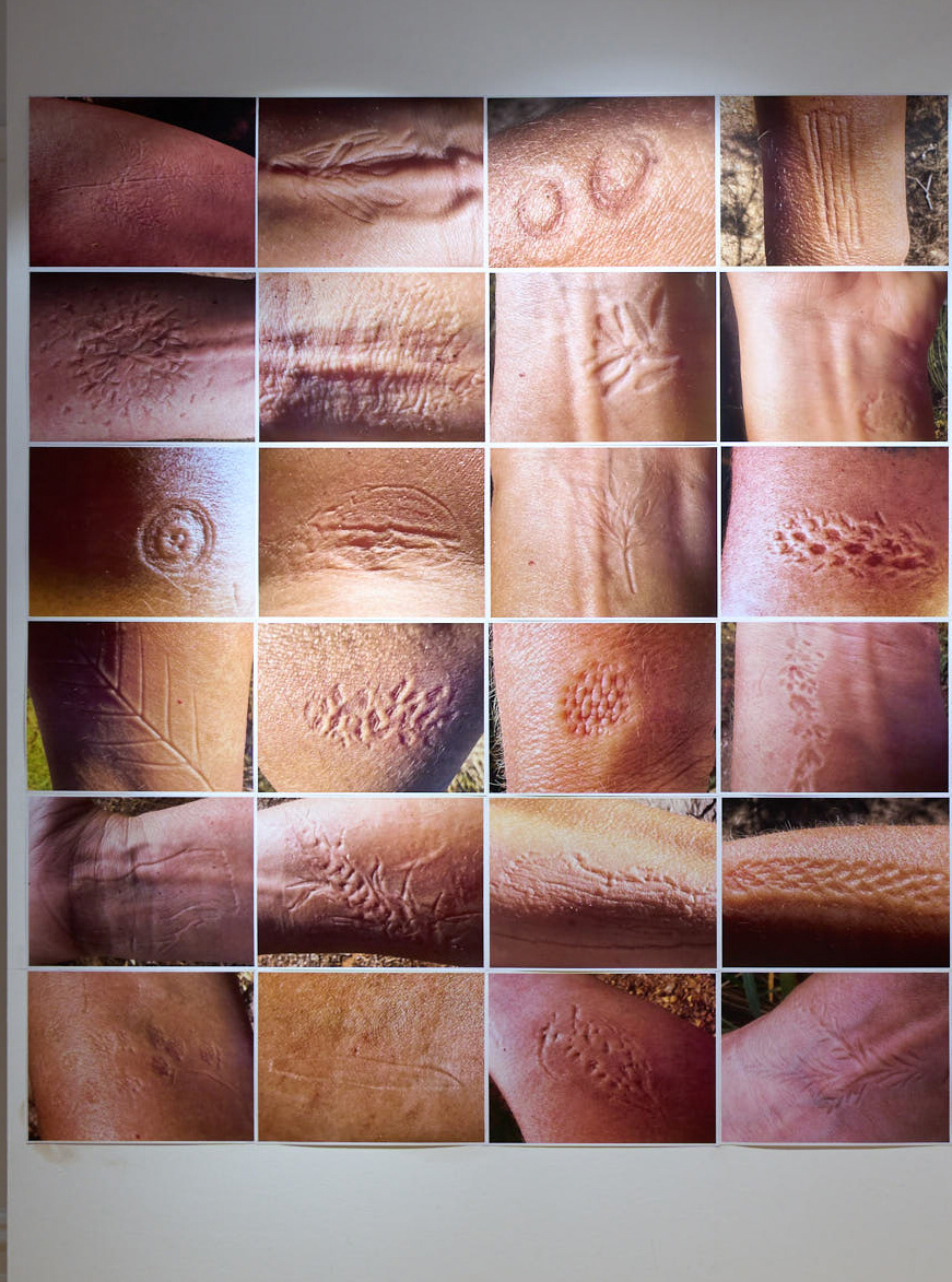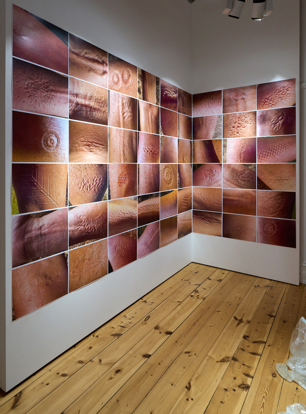 Imprining (feel the sensation) Installation view of 45 prints of plant imprints pressed into my skin